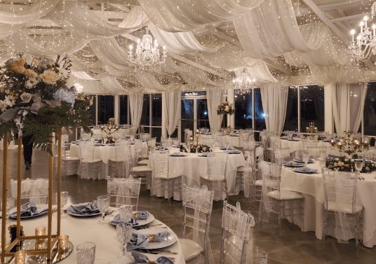 The Barn Venue blends rustic charm with modern elegance, offering a welcoming space for larger guest lists. With draped interiors, vintage accents, and a cozy yet sophisticated atmosphere, it’s the perfect setting for couples seeking a memorable, stylish celebration.